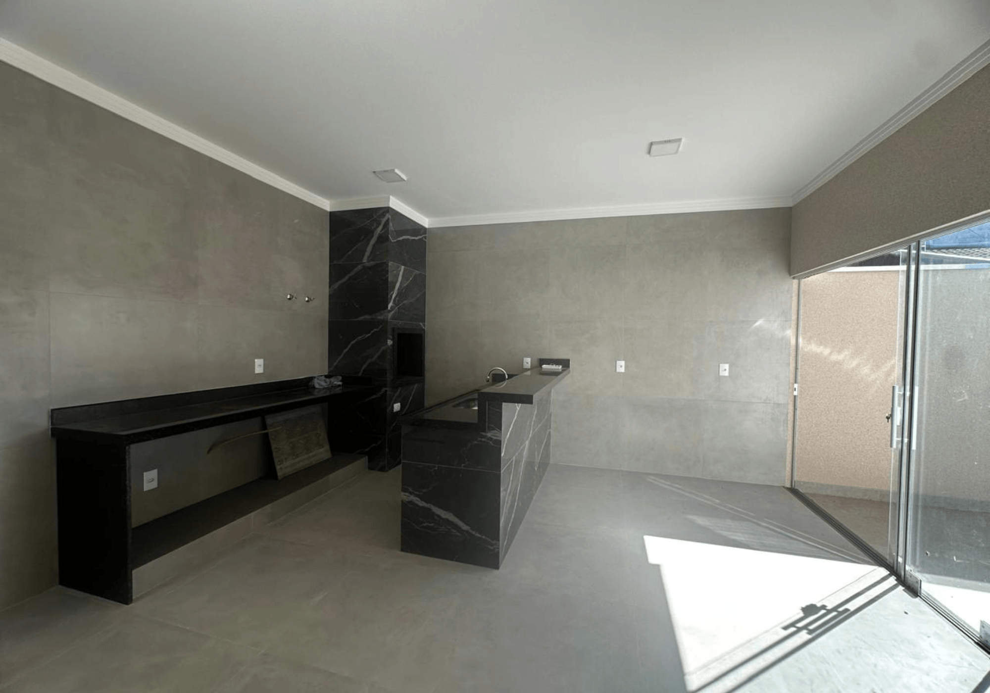 A cozinha possui ilha central e integração com o espaço gourmet, equipado com churrasqueira, ideal para receber amigos e familiares. Ambientes iluminados com spots de LED, proporcionando modernidade e sofisticação.