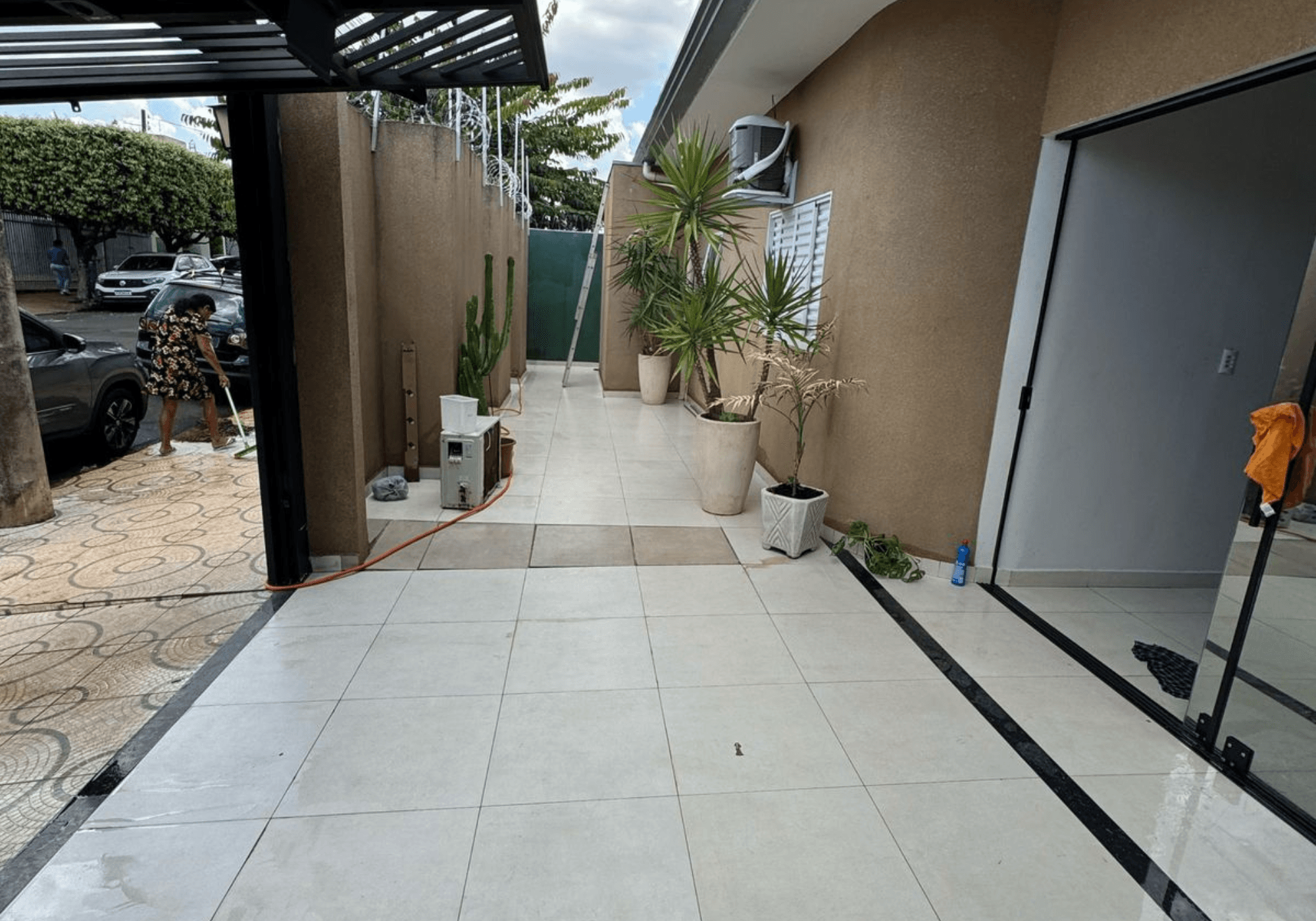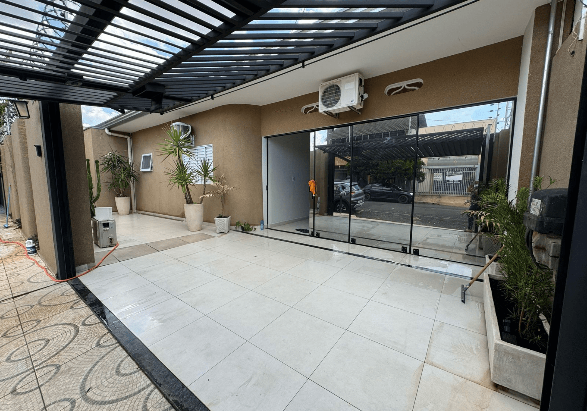 A garagem para 3 carros foi fechada em vidro e transformada em recepção, ideal para atendimento ao público. Corredor lateral, duas entradas independentes (possibilitando funcionamento de duas empresas distintas), portão eletrônico com portão social, serpentina, cerca elétrica e acabamento todo em porcelanato.