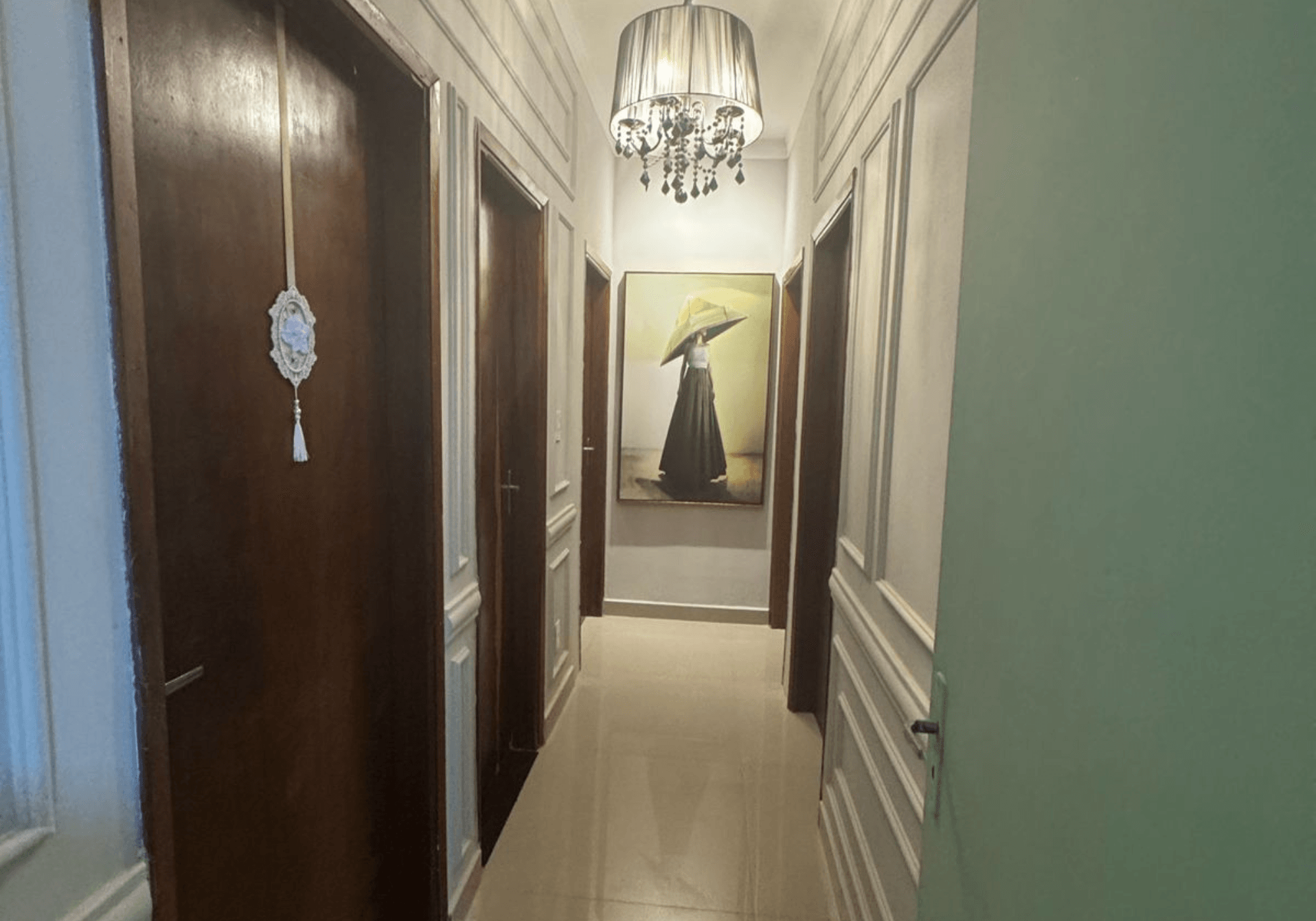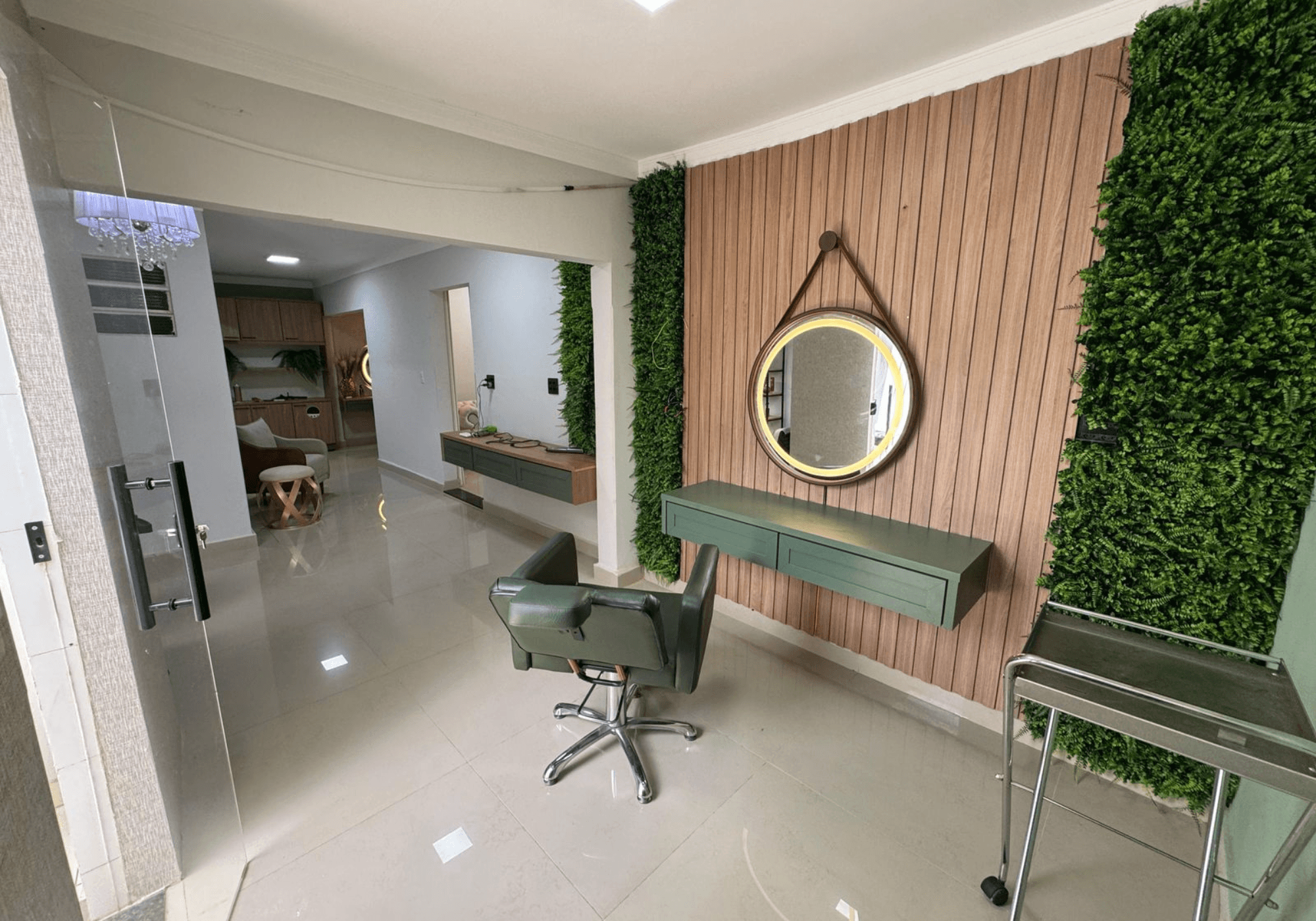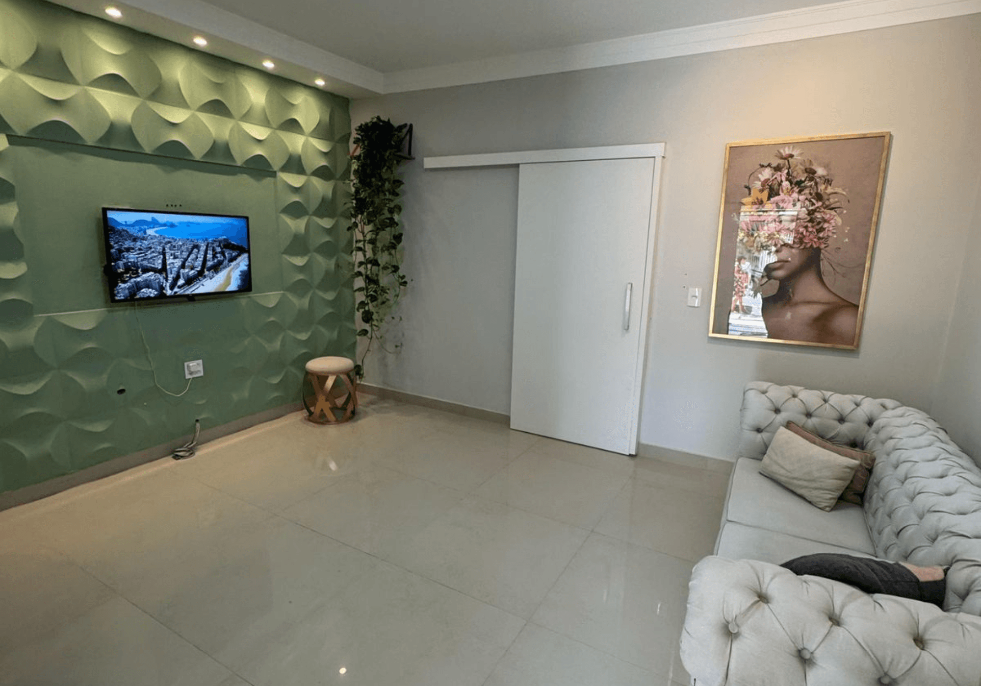 A casa possui 4 dormitórios, sendo 1 suíte e 2 deles com armários. Banheiro social totalmente reformado com planejados. Sala ampla com sancas, iluminação diferenciada e revestimentos modernos. Todas as portas foram laqueadas em verde, trazendo identidade ao espaço.